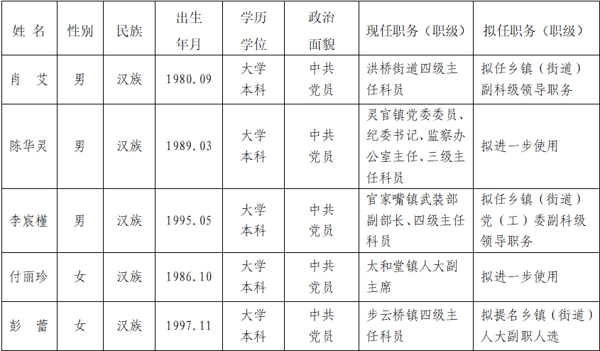 为了加强对干部选拔工作的监督,提高识别和任用干部的准确程度,现对祁东县委常委会会议研究的下列拟任人选进行任前公示: